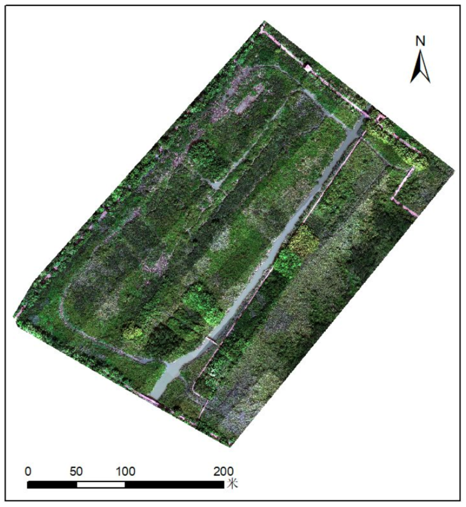 在 GIS 应用软件中,对重建好的数字正射影像图(DOM)和数字表面模型(DSM)进行裁剪,得到实验区的正射影像图。