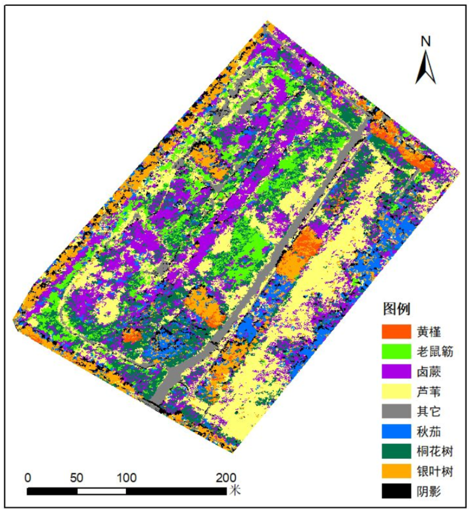 根据试验区地块的属性,该地块包含老鼠簕、黄槿、卤蕨、秋茄、桐花树、银叶树、芦苇等 7 种主要植物;水体与人工建筑归为其它类型;阴影对分类结果影响较大,单独分为一类,共计 9 类地物。
