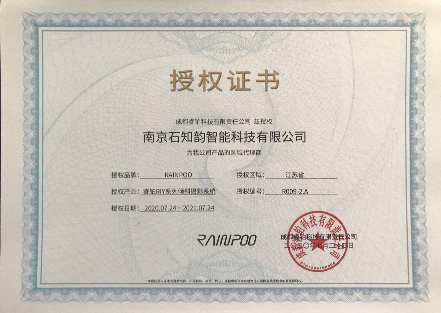 我司荣获成都睿铂科技授权证书